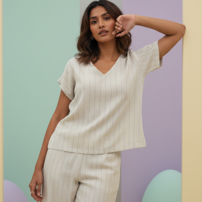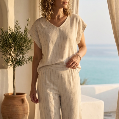 Set en lino – Blusa y Palazzo – Talla M – Rayas Verdes